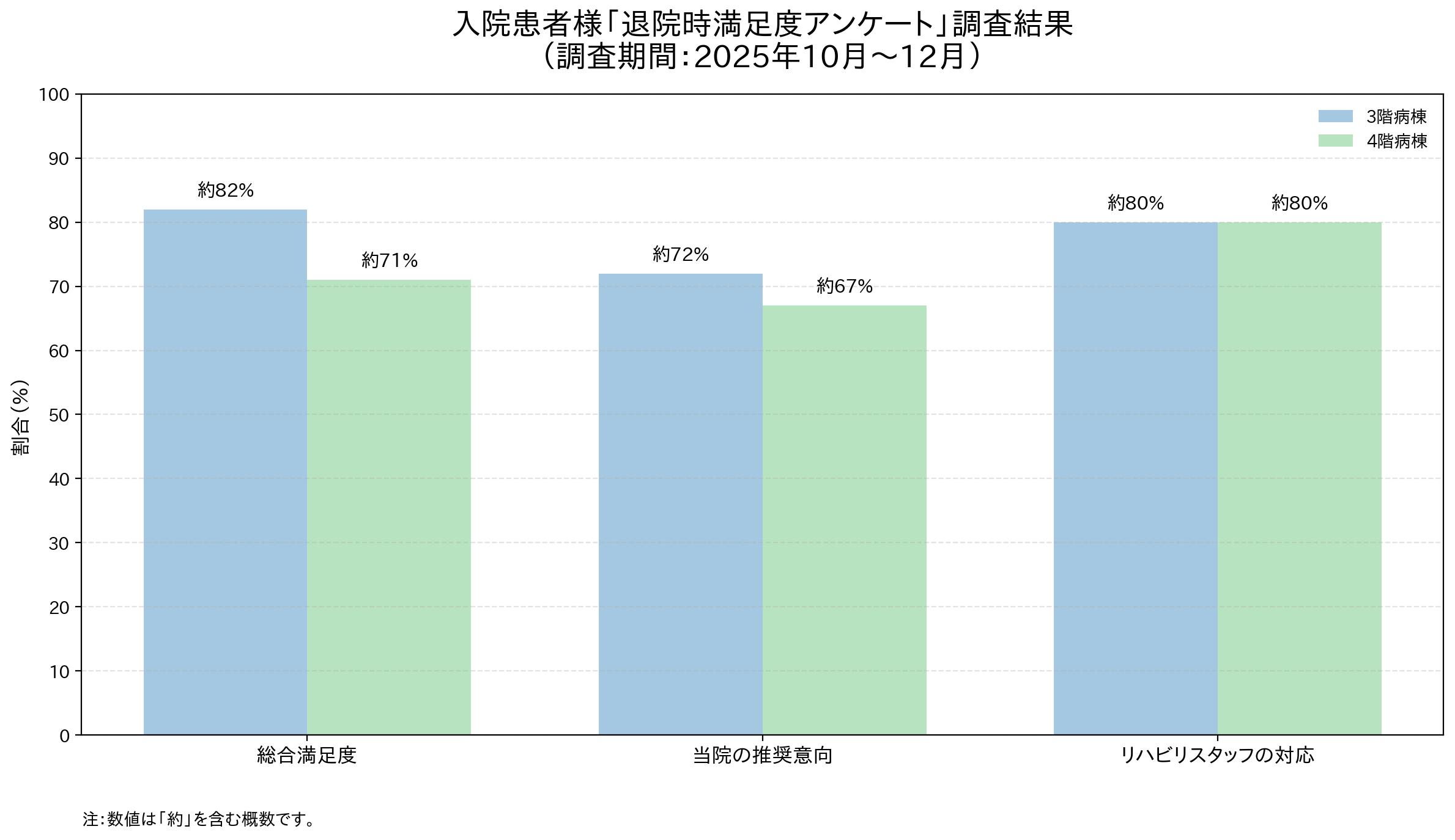 当院では、入院生活におけるサービスの向上とより良い医療・ケアの提供を目指し、退院される患者様を対象に満足度アンケートを実施しております。